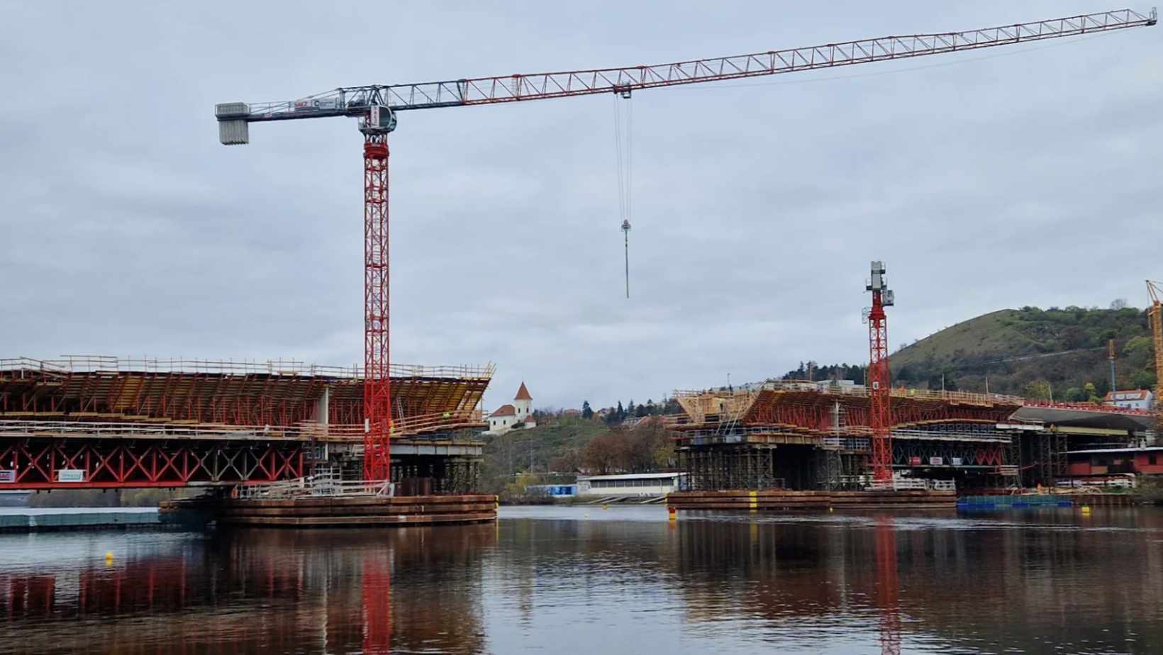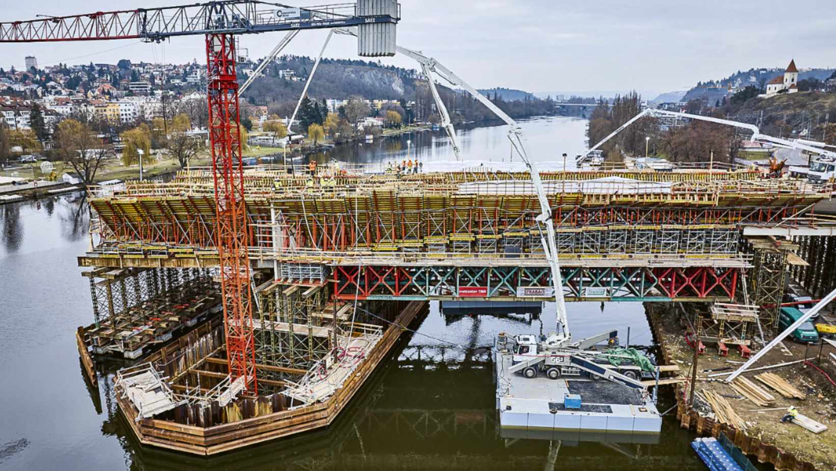“Recently, we managed to install the formwork, concrete, and prestressing reinforcement for the third span of the bridge. This required an impressive continuous pouring of around 1,000 cubic meters of concrete over a 36-hour period. To accomplish this, two concrete pumps were strategically positioned on floating pontoon assemblies within the Vltava River,” reported Metrostav TBR in their company newsletter.